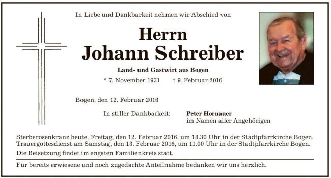 Johann Schreiber verstarb am Dienstag, den 09.02.2016 im Alter von 84 Jahren. Johann ist seit dem Gründungsjahr 1966 und somit seit 50 Jahren Mitglied bei den Bogener Sportschützen. Durch seine wohlgesonnene Unterstützung sind wir Ihm zu großem Dank verpflichtet. Der gesamte Schützenverein fühlt mit der Familie und allen Angehörigen und wird Johann Schreiber stets in ehrender Erinnerung bewahren.