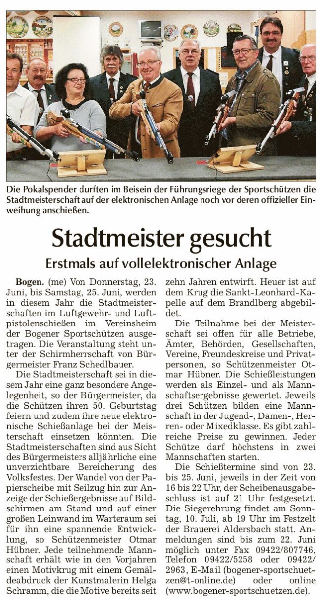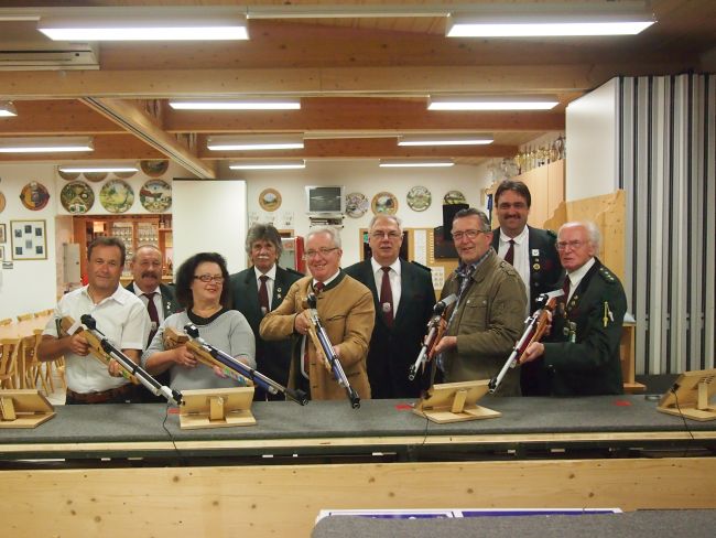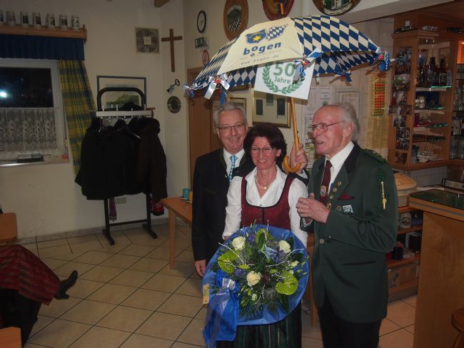 Offizeller Auftakt zum 50-jährigen Gründungsfest der Bogener Sportschützen mit Einweihung einer neuen Schießanlage bildete das Schirmherrnbitten. Schützenmeister Otmar Hübner begrüßte im Bogener Schützenheim besonders Herrn Stadtpfarrer Johann Schön, Ehrenfahnenmutter Olga Eckl, Ehren- und Gründungsmitglied Josef Kroiß, Ehrenmitglied Elmar Eckl, Gründungsmitglied Otto Muhr, die Stadtratsmitglieder Werner Ibel und Bürgermeister Franz Schedlbauer mit Gattin. In bayerischer Versform versuchte der 1. Schützenmeister den Bürgermeister der Stadt Bogen von der Übernahme der Schirmherrschaft zu überzeugen. Mit einem klaren JA bekräftigte Bürgermeister Schedlbauer seine Bereitschaft dieses Amt zu übernehmen. Als Symbol für ein hoffentlich schönes Festwetter und vor allen Dingen einen unfallfreien Umbau der Schießanlage wurde ein weiß-blauer Rautenschirm überreicht. Gattin Marianne erhielt als kleines Dankeschön für den bevorstehenden zeitlichen Verzicht auf Ihren Ehemann einen Blumenstrauß. Der Schirmherr lud alle Schützen zu einem zünftigen Leberkasessen und anschließenden Kuchenbuffet ein. Ein schöner Abend klang mit viel Vorfreude auf den kommenden Festabend, am 18.Juni 2016 mit der Einweihung der neuen Schießanlage aus.