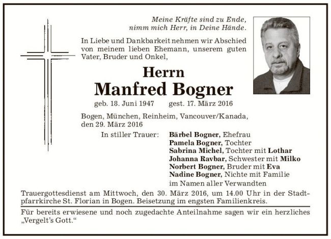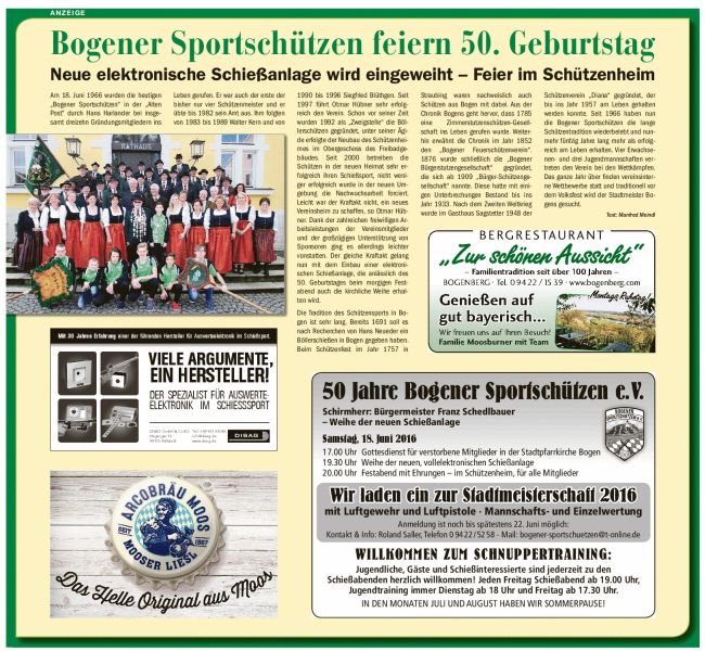 Manfred Bogner verstarb am Freitag, den 18.03.2016 im Alter von 68 Jahren. Manfred war seit 35 Jahren Mitglied bei den Bogener Sportschützen. Durch seine wohlgesonnene Unterstützung sind wir Ihm zu großem Dank verpflichtet. Der gesamte Schützenverein fühlt mit der Familie und allen Angehörigen und wird Manfred Bogner stets in ehrender Erinnerung bewahren.