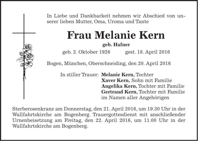 Melanie Kern verstarb 18.04.2016 kurz vor Ihrem 90. Geburtstag. Melanie war seit 34 Jahren Mitglied bei den Bogener Sportschützen. Durch ihre wohlgesonnene Unterstützung sind wir Ihr zu großem Dank verpflichtet. Der gesamte Schützenverein fühlt mit der Familie und allen Angehörigen und wird Melanie Kern stets in ehrender Erinnerung bewahren.
