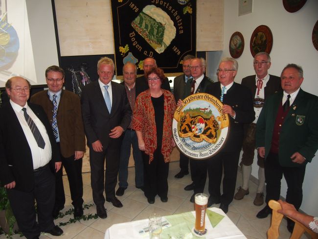 Schirmherr Franz Schedlbauer, Bürgermeister der Stadt Bogen stiftete nicht nur die Einweihungsscheibe, sondern überraschte den Festverein mit einer sehr schönnen Festscheibe.