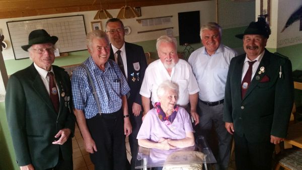 Ehrengauschützenmeister Bethold Amann und 2. Bürgermeister Helmut Muhr; Ehrenmitglied Elmar Eckl und Ehrenfahnenmutter Olga Eckl